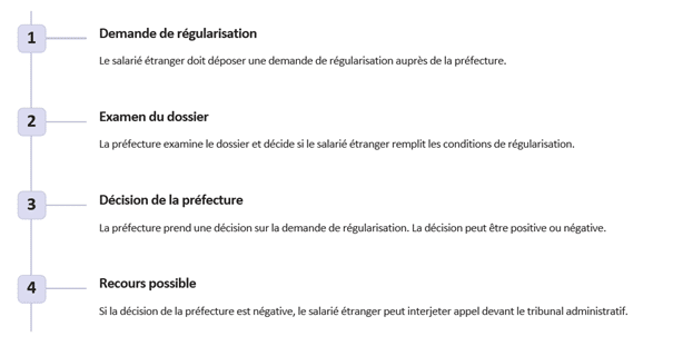 Le salarié étranger en situation irrégulière peut demander une régularisation de son séjour en France. Il existe plusieurs procédures de régularisation, notamment le regroupement familial, le mariage avec un citoyen français, la demande d’asile ou la régularisation pour services rendus.